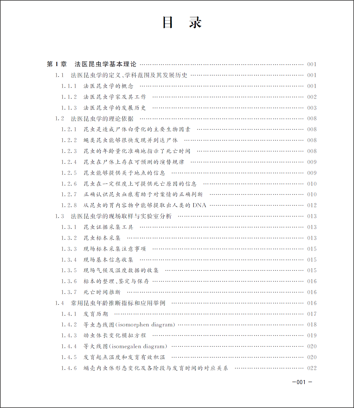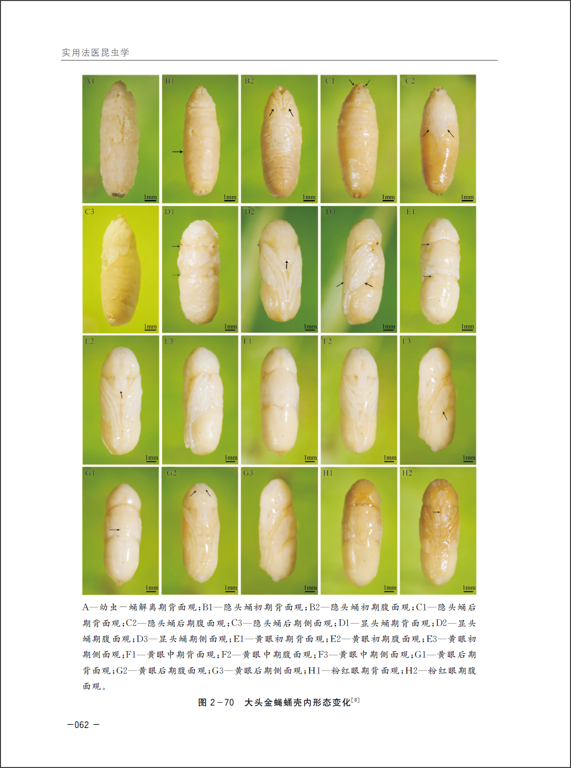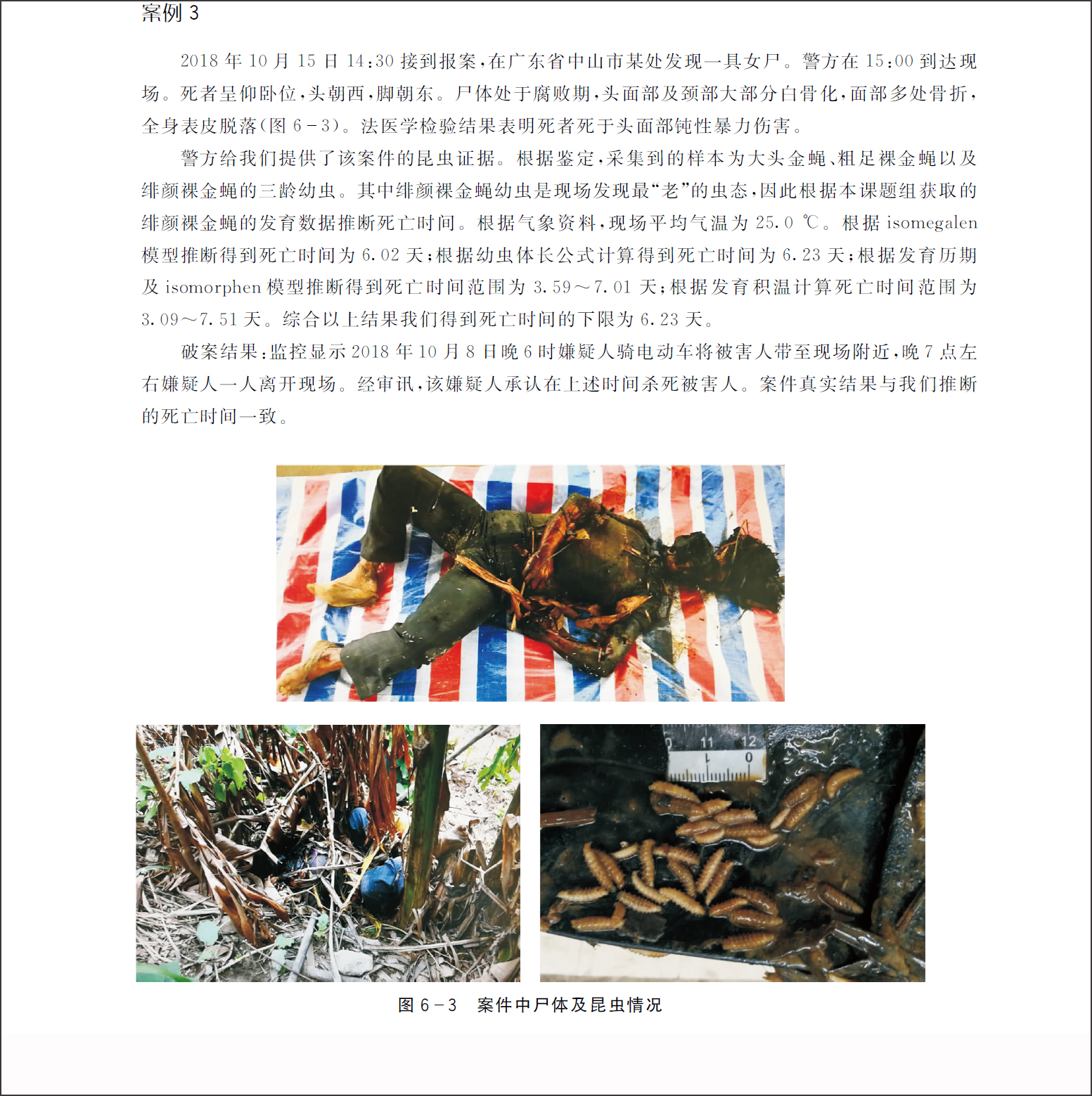 在《实用法医昆虫学》一书中集中展示了法医昆虫学死亡时间推断技术。该书58万字(含插图约560张),内容主要包括基于昆虫死亡时间推断的基础理论、尸食性昆虫原位彩图、常见法医学昆虫幼虫及成虫的鉴定技术、人类尸体逐日变化彩图及其详细参数、尸食性昆虫死亡时间应用指标及具体的实战使用方法、现场标准化操作、应用案例等。法医昆虫学主要利用幼期昆虫推断死亡时间,《实用法医昆虫学》包含了中国常见尸食性昆虫(蝇类及甲虫)幼虫的形态图及鉴别信息,另外也包含了其它书中所没有的大量应用数据。该书可用作法医学及昆虫学的教学参考书,亦可用作法医实战的工具书。