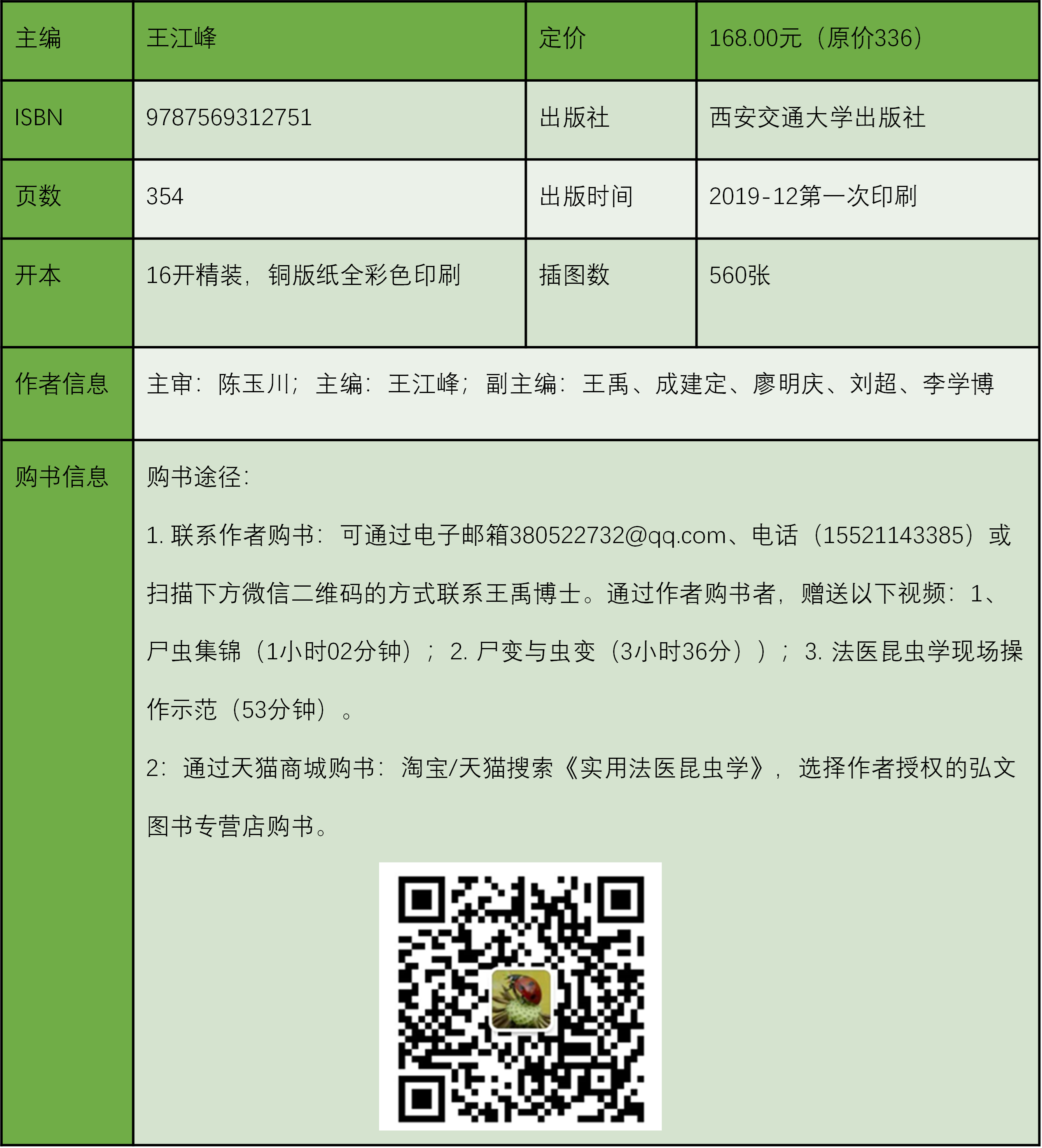 在《实用法医昆虫学》一书中集中展示了法医昆虫学死亡时间推断技术。该书58万字(含插图约560张),内容主要包括基于昆虫死亡时间推断的基础理论、尸食性昆虫原位彩图、常见法医学昆虫幼虫及成虫的鉴定技术、人类尸体逐日变化彩图及其详细参数、尸食性昆虫死亡时间应用指标及具体的实战使用方法、现场标准化操作、应用案例等。法医昆虫学主要利用幼期昆虫推断死亡时间,《实用法医昆虫学》包含了中国常见尸食性昆虫(蝇类及甲虫)幼虫的形态图及鉴别信息,另外也包含了其它书中所没有的大量应用数据。该书可用作法医学及昆虫学的教学参考书,亦可用作法医实战的工具书。
